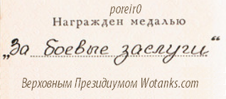 За проявленное мужество в боях, внимательность и помощь в развитии сайта, форум танкистов выражает благодарность игроку World of Tanks с ником poreir0