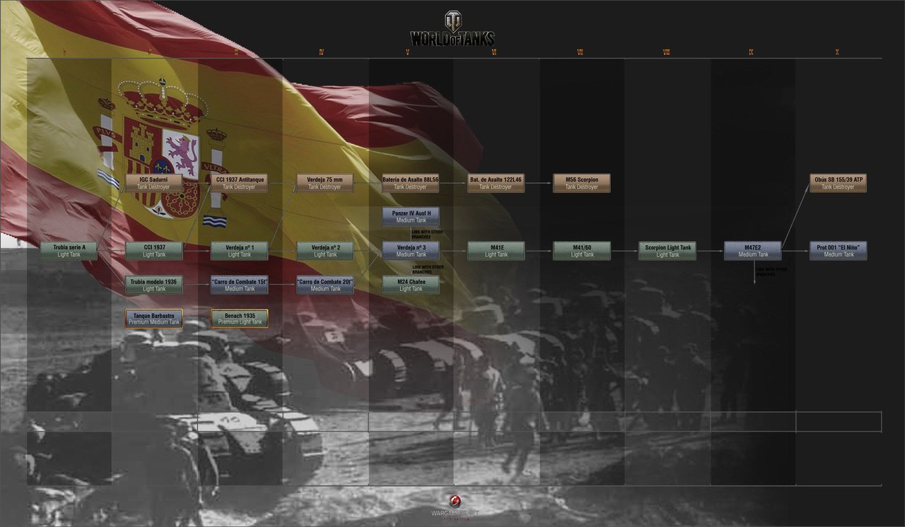 Дерево развития испанских танков в World of Tanks опубликовано впервые на wotanks.com. По нашим данным, разработчики уже создают первые модели танков для испанской ветки развития.