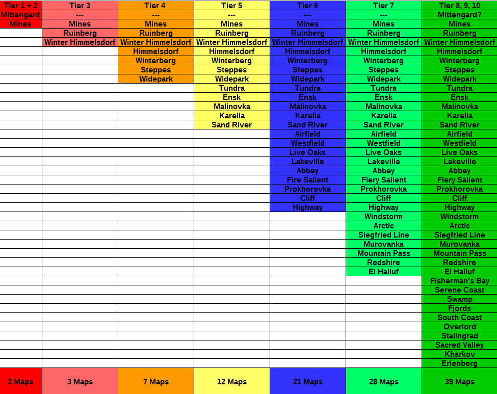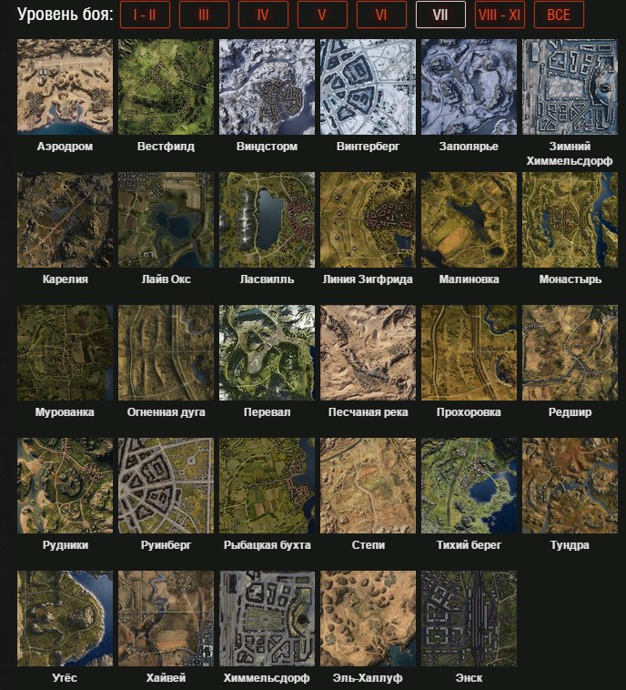 - Tier 7: Winter Himmesdorf, Himmelsdorf, Mines, Ruinberg, Winterberg, Steppes, Widepark, Tundra, Ensk, Malinovka, Karelia, Sand River, Airfield, Westfield, Live Oaks, Lakesville, Abbey, Fiery Salient, Prokhorovka, Cliff, Highway, Windstorm, Arctic, Siegfried Line, Murovanka, Mountain Pass, Redshire, El Halluf,