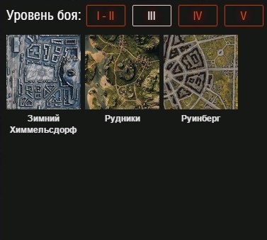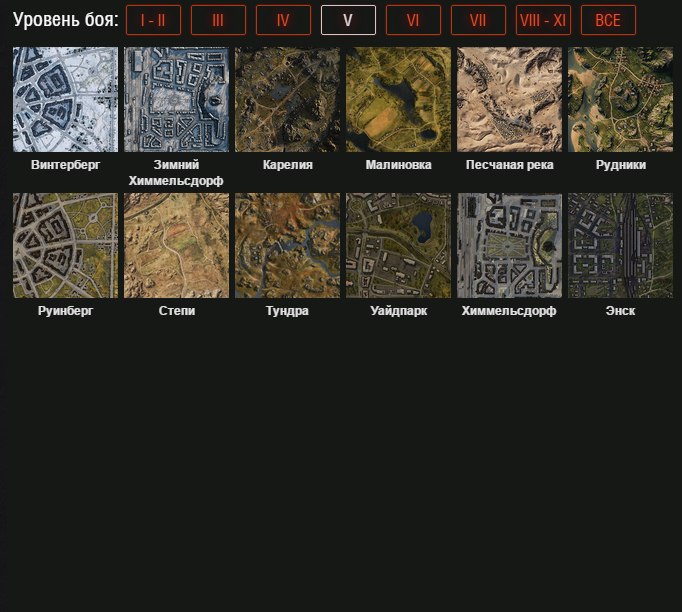- Tier 5: Winter Himmesdorf, Himmelsdorf, Mines, Ruinberg, Winterberg, Steppes, Widepark, Tundra, Ensk, Malinovka, Karelia, Sand River
