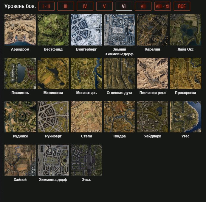 - Tier 6: Winter Himmesdorf, Himmelsdorf, Mines, Ruinberg, Winterberg, Steppes, Widepark, Tundra, Ensk, Malinovka, Karelia, Sand River, Airfield, Westfield, Live Oaks, Lakesville, Abbey, Fiery Salient, Prokhorovka, Cliff, Highway