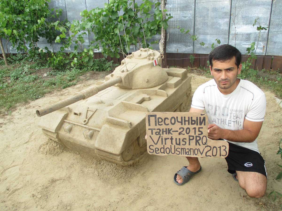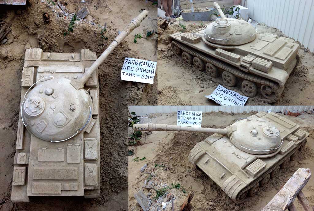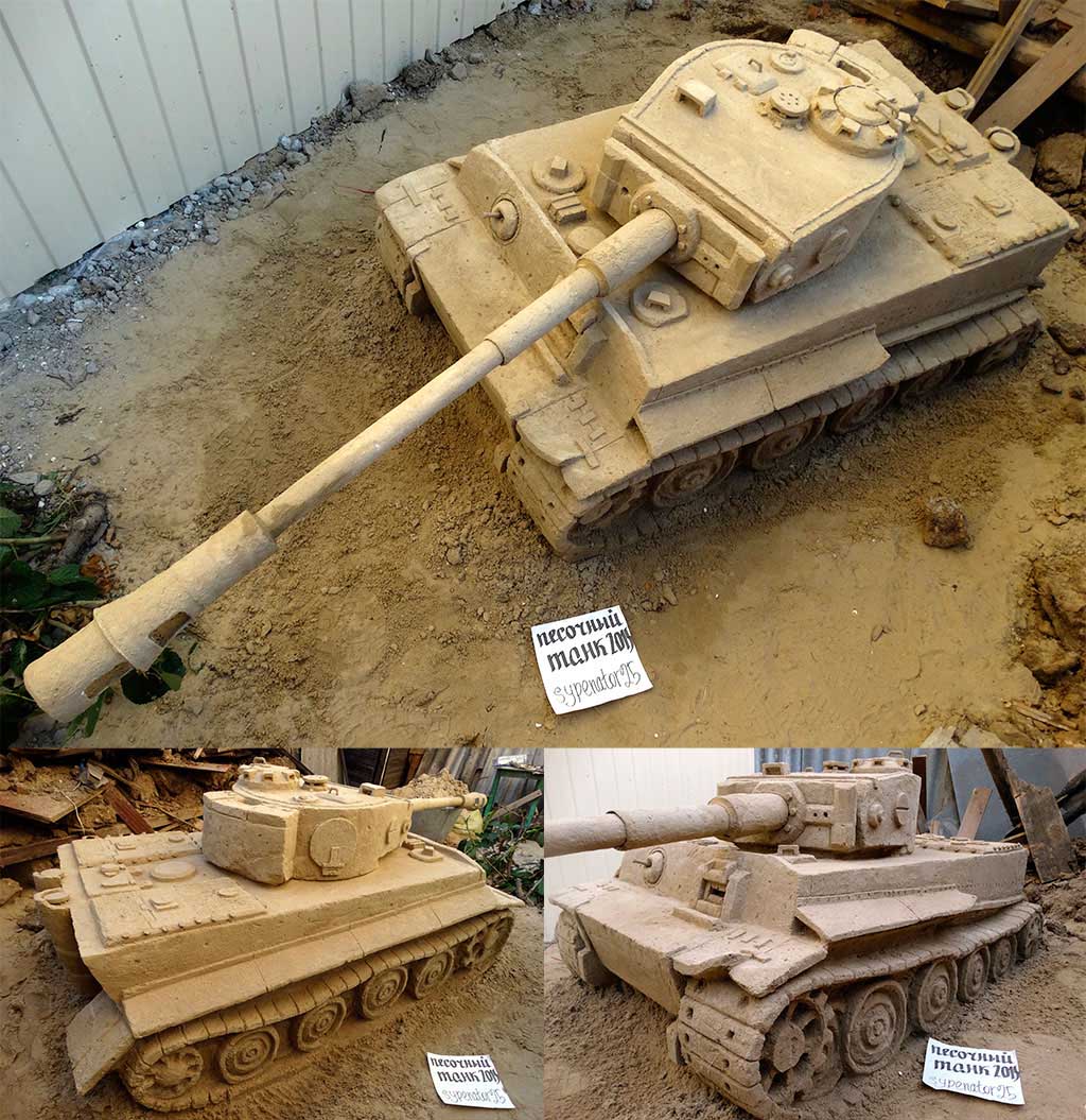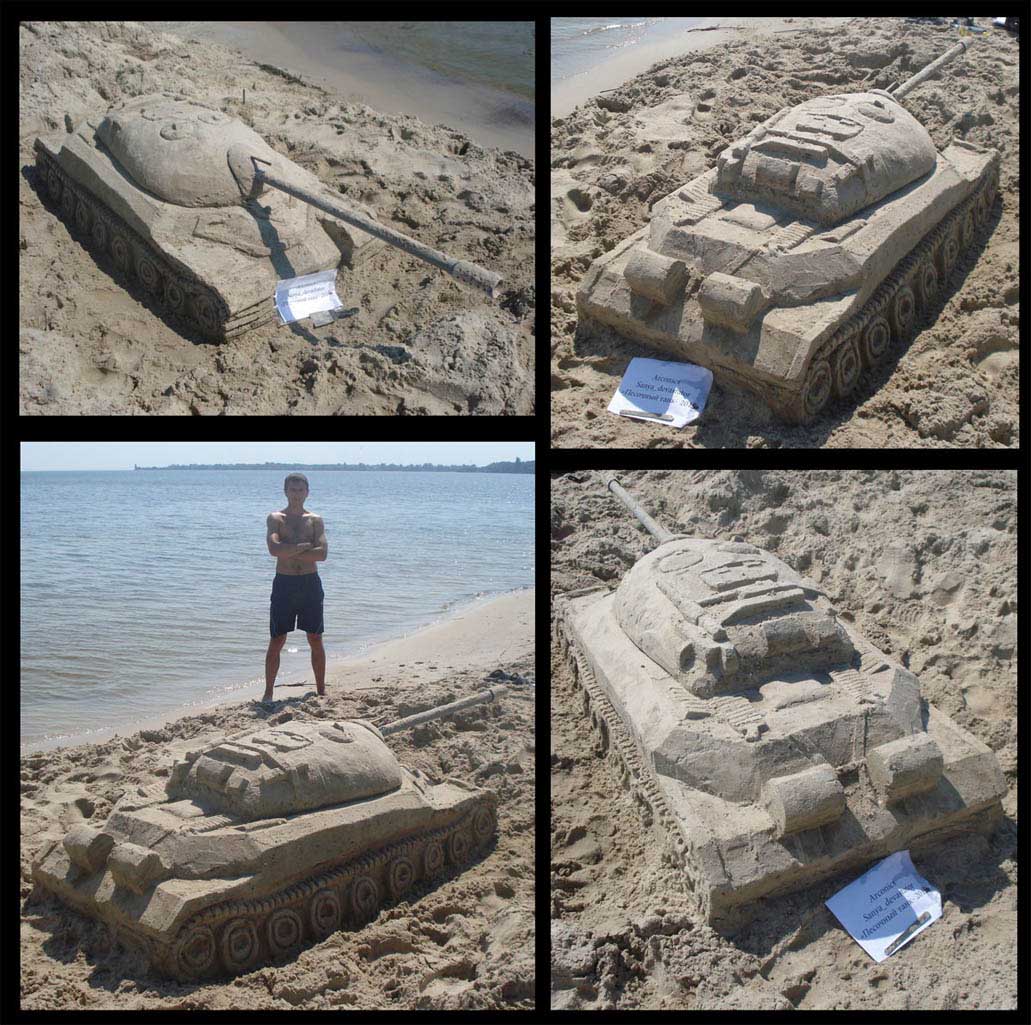 Немного стараний, воды и несколько скребков. Результат: танк из песка.