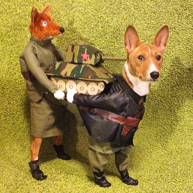 Получен приказ выдвигать тяжелую технику на передовую: собака в костюме с танком.