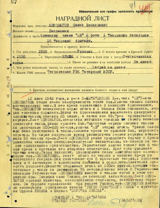 Лейтенант Коновалов проявил мужество, непоколебимую стойкость, беззаветный героизм, — говорится в наградном листе. — За героизм, проявленный при защите Родины, тов. Коновалов достоин посмертного присвоения звания «Герой Советского Союза» с вручением ордена Ленина и медали «Золотая Звезда».