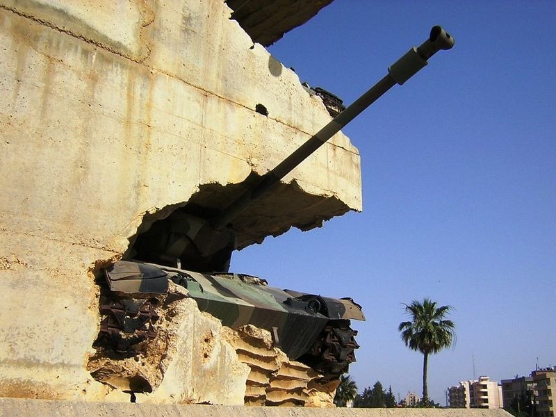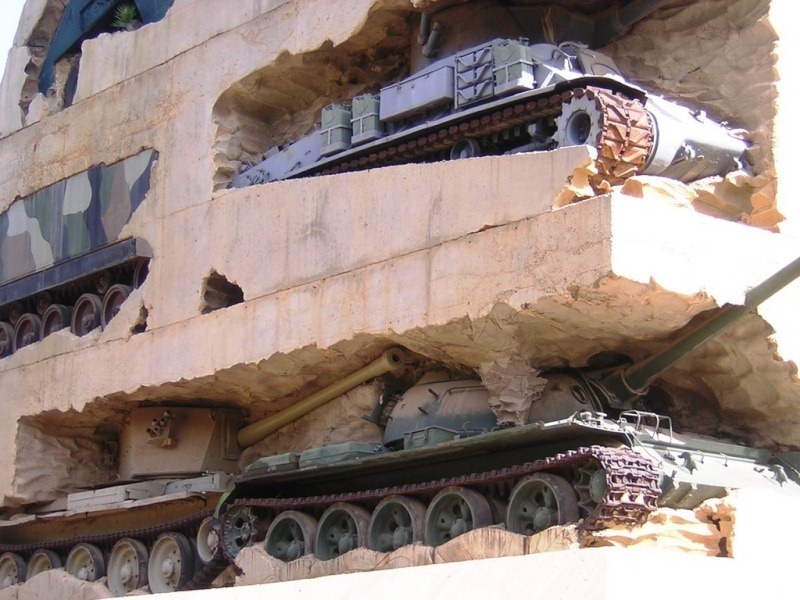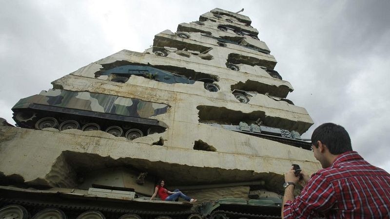 Возле входа в Министерство национальной обороны, стоит эта башня реальных танков, артиллерийских орудий, минометов и бронетехники, зажатой между толстыми слоями бетона.