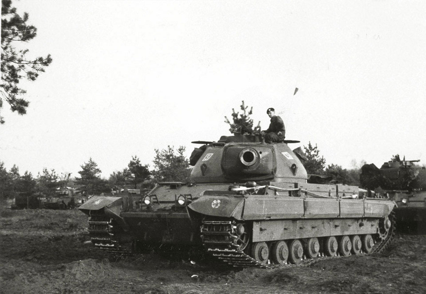 На черно-белом снимке изображен танк Conqueror с повернутым стволом орудия в сторону фотографа.