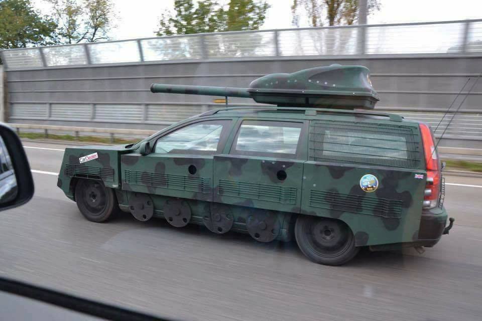 Как видно, танкист приделал на крышу своего танкомобиля даже башню с орудием. Между колес самодельного танка сделаны фейковые катки, напоминающие танковые гусеницы.