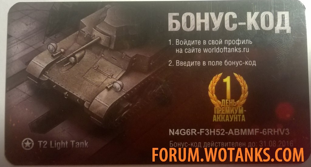 Бонус код на World of Tanks действующий на март 2016 дает 1 день премиум аккаунта и премиум танк T2 Light Tank